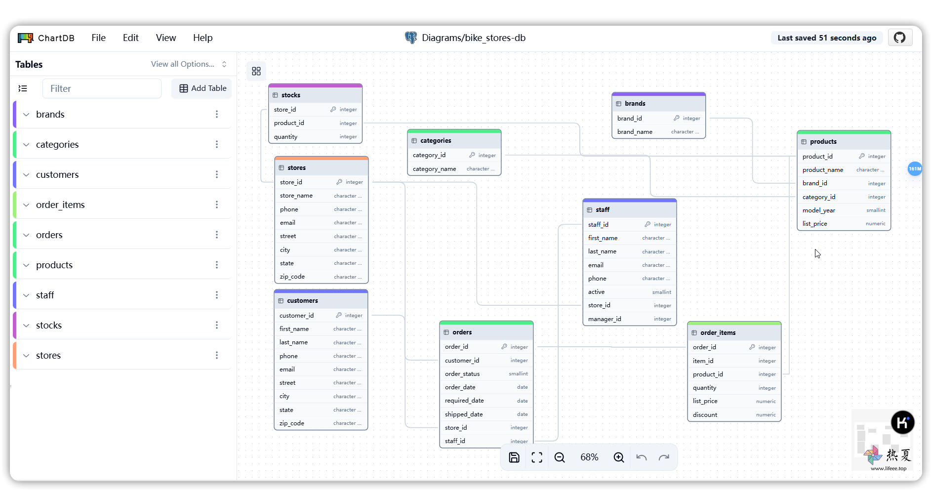 ChartDB 是一个专注于数据库结构设计和可视化的工具,支持 MySQL、PostgreSQL、SQLite、MariaDB 和 MSSQL 等主流数据库。该工具允许用户通过简单的 SQL 查询实时生成数据库的图示,并且支持导出图表以进行数据库的进一步设计或迁移。其开源性质为开发者提供了灵活性,用户可根据需求定制和扩展工具功能。使用 React 和 TypeScript 开发,ChartDB 支持现代开发流程,并且通过其直观的用户界面提升了数据库管理和设计的效率。该工具适合数据库开发者、架构师和 DevOps 工程师,帮助他们快速生成 ERD(实体关系图)并执行数据库迁移任务。