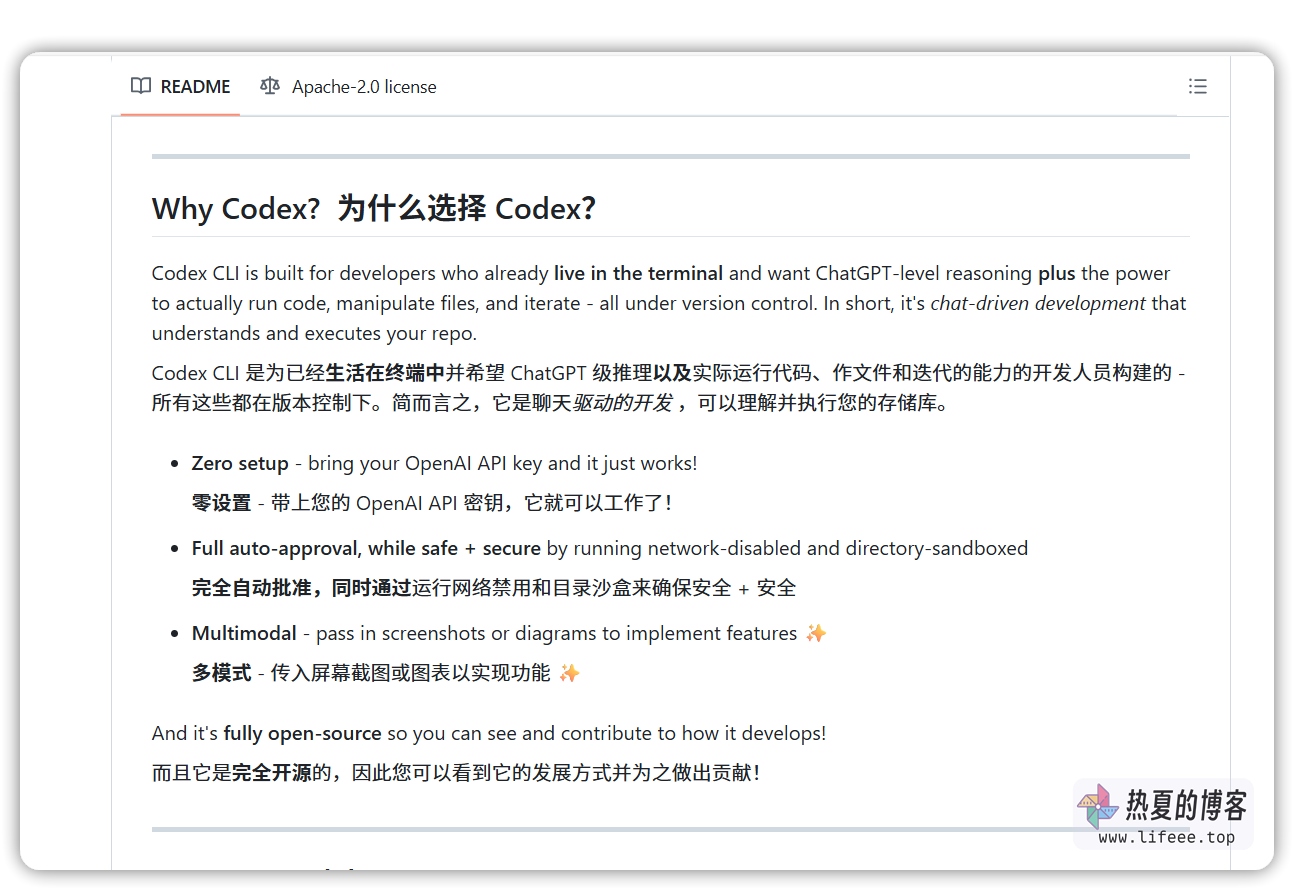 OpenAI 开源的 Codex 项目是一个在终端运行的轻量级编码代理,能够将自然语言转化为可执行代码。Codex 的使用非常简单,通过全局安装并设置 OpenAI API 密钥即可使用。它为开发者提供了 ChatGPT 级别的推理能力,支持在版本控制下运行代码、操作文件和迭代。Codex 的特点包括零配置、全自动审批、多模态支持(支持传入截图或图表),并且完全开源。项目地址为 https://github.com/openai/codex,用户可以自行查看和参与其发展。